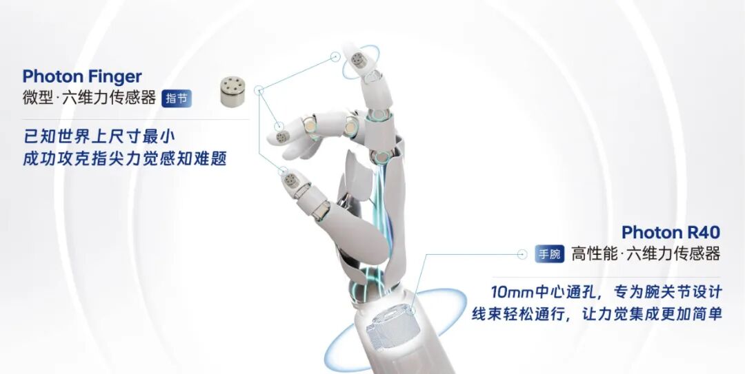 Photon Finger — The World’s Smallest Six-Dimensional Force Sensor Utilizing integrated metal additive manufacturing, each batch can be fabricated in just 20 minutes, with 15–30 units per build. · Overload tolerance: improved by 50–250% · Compact form factor: delivers superior mechanical resilience and signal fidelity Photon Finger Max — Second-Generation Multi-Dimensional Sensor With a diameter of only 9.5 mm and a load range increased 23× to 700 N, the sensor uses high-strength alloys and structural optimization to enable rapid design iteration and long-term reliability.