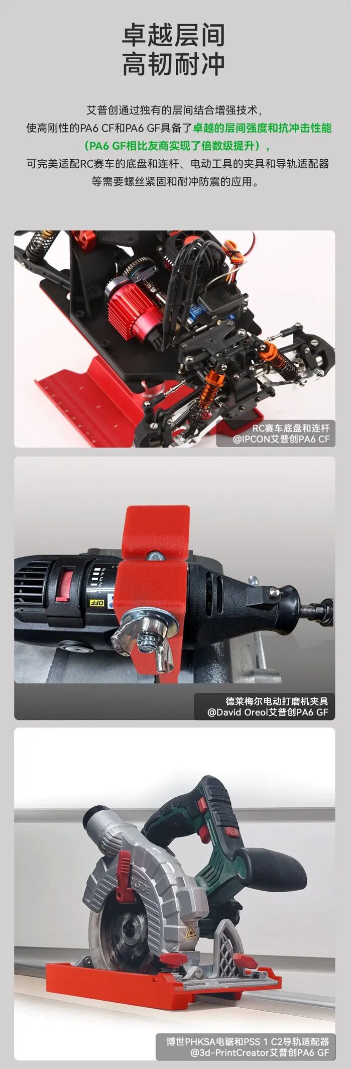 1. High Strength and Heat Resistance with Minimal Warping Through proprietary carbon and glass fiber reinforcement technologies, IPCON PA6 CF and PA6 GF exhibit exceptional stiffness, strength, and heat resistance — with heat deflection temperatures reaching 197°C and 191°C, respectively. This delivers a substantial leap in the mechanical performance of printed parts. More impressively, IPCON’s unique formulation effectively addresses PA6’s notorious warping issue. With a simple adhesive coating, large components can be printed without a heated chamber, while maintaining excellent surface finish. These properties make the materials ideal for high-strength, heat-resistant components used in dry environments that also demand good aesthetics — such as dehydrator trays, air fryer handles, and hairdryer nozzles.
