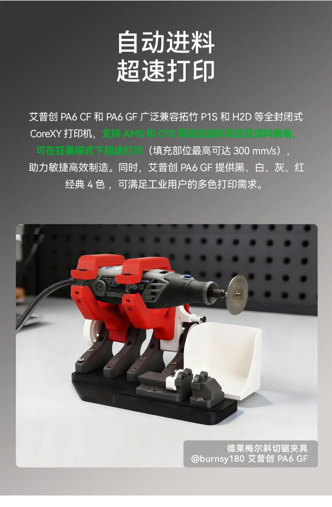 3. Automatic Feeding and Ultra-Fast Printing Both filaments are fully compatible with Bambu Lab P1S, H2D, and other enclosed CoreXY 3D printers. They support AMS, CFS, and other automatic feeding and spool-change systems, enabling ultra-fast “beast mode” printing — with infill speeds reaching up to 300 mm/s, dramatically improving production efficiency. The PA6 GF variant comes in four industrial colors — black, white, gray, and red — to meet multi-color application needs in professional settings.