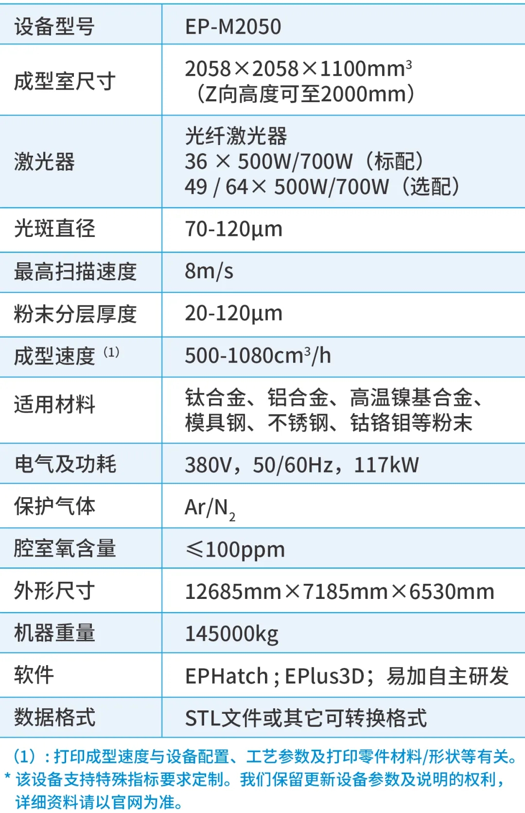 On July 1, 2024, Tianyancha revealed that Hangzhou Yijia 3D Additive Technology Co., Ltd. (杭州易加三维增材技术股份有限公司)has secured a B+ round of financing, raising several hundred million RMB. Participating investment institutions include Guotou Chuanghe, Yuanchuang Duoying Capital, and Bingzhuang Fund. Notably, Guotou Chuanghe and Yuanchuang Duoying Capital have participated in the second round of investment. To date, Yijia 3D has received significant investments from national-level funds such as Bingzhuang Fund, Guotou Chuanghe, and Avi Engine Fund, demonstrating strong government support! △Historical Financing of Hangzhou Yijia 3D Additive Technology Co., Ltd. Hangzhou Yijia 3D Additive Technology Co., Ltd. was founded in 2014 and has since become one of the leading manufacturers of metal 3D printing technology in China. The EP-M2050: A large-scale metal 3D printer with a build volume of 2 meters and an 8 matrix configuration with 64 lasers.On May 7, 2024, Yijia 3D has added a new member to its metal additive manufacturing system product line: the EP-M2050. This machine features a build volume of 2058mm x 2058mm x 1100mm (Z-axis customizable up to 2000mm), significantly expanding the size capabilities of SLM additive manufacturing technology. It broadens the range of applications for large-scale components and opens up more possibilities for industrial smart production. The EP-M2050 employs matrix laser arrangement technology, standardly configured with six matrices, thirty-six lasers, and thirty-six mirrors. Optionally, it can be configured with seven matrices and forty-nine lasers or eight matrices and sixty-four lasers. In standard configuration, the maximum build speed can reach 1080 cm³/h (for stainless steel), approximately 100% faster than the standard EP-M1550 (four matrices, sixteen lasers). At the 2024 TCT Asia exhibition, Yijia 3D showcased a 2-meter metal part printed by the EP-M2050. *Note: Build speed is related to equipment configuration, process parameters, and the material or shape of the printed part. For example, when using titanium alloy material, the maximum build speed with thirty-six lasers is 1860 cm³/h. Larger and Stronger, Quality Assurance