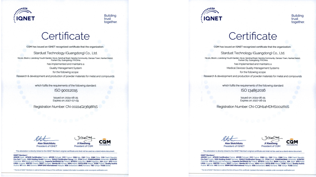 Stardust Technology (Guangdong) Co.,Ltd. is a national high-tech enterprise specializing in the research, development, production and sales of high-end spherical powder materials used in additive manufacturing, powder metallurgy, surface engineering and other fields. Adhering to core technologies such as radio frequency plasma spheroidization, the company provides internationally advanced powder products and application solutions. Stardust Technology's main products include high-end rare refractory metals and their alloys and compounds spherical powders such as tungsten, molybdenum, tantalum, niobium, vanadium, titanium, zirconium, hafnium, rhenium, chromium etc. The company also provides technical services such as radio frequency plasma spheroidization, plasma rotating electrode atomization, 3D printing, hot isostatic pressing, injection molding, powder metallurgy, etc. Stardust Technology's R&D team comes from the New Materials Research Institute of the Guangdong Academy of Sciences. The institute has been committed to the powder preparation modification, application research and promotion. Research centers have been established, such as "National Titanium and Rare Metal Powder Metallurgy Engineering Technology Research Center", "Guangdong Metal Powder Materials Engineering Technology Research Center" and "Guangzhou Powder Materials and Precision Parts Manufacturing Engineering Technology Research Center”. 13 technical staff, 8 with doctor degrees and 5 with master degrees. There are internationally leading high-end powder preparation and forming equipment such as Canadian TEKNA radio frequency plasma spheroidization equipment, Ukrainian plasma rotating electrode atomization equipment, Swedish Quintus hot isostatic pressing equipment, and German EOS 3D printing equipment. RF plasma powdering system- Tekna 40KW RF plasma powdering system- Tekna 40KW RF plasma powdering system- Tekna 15KW Hot isostatic pressing equipment 3D printing equipment Stardust Technology was the first in China to manufacture the mass production of spherical tantalum and tantalum alloy powders, spherical tungsten and tungsten alloy powders, spherical niobium and niobium alloy powders for additive manufacturing, and other powders. The company has drafted and formulated nearly 10 national standards, including "Tantalum and tantalum alloy powders for additive manufacturing", "Niobium and niobium alloy powders for additive manufacturing", "Tungsten and tungsten alloy powders for additive manufacturing", "Molybdenum and molybdenum alloy powders for additive manufacturing", "Powder bed fusion additive manufacturing of tantalum and tantalum alloys", and "Medical pure tantalum powder for additive manufacturing". The company has a number of core invention patents, including "A 3D printing manufacturing method and application of metallic tantalum", "A spherical powder of nickel-titanium alloy and its preparation method and application", "Separation and recovery device and method and application of micro-nano composite powders", and got Quality Management System Certificate ISO9001 and Medical Devices Quality Management Systems ISO13485 Certificate,looking forward to cooperate for the bright additive manufacturing future. Contact Stardust Technology (Guangdong) Co., Ltd. ADD : No. 101, Building 1, Liandong Youzhi Zone, Senshuji Road, Nansha Community, Danzao Town, Nanhai District, Foshan City, Guangdong Province, China Tel:+86-13318326185/+86-13318326187 Email:sales1@stardustpowder.com/sales2@stardustpowder.com www.stardustpowder.com |