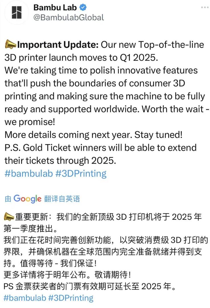 Bambu Lab's latest 3D printer will cater to professional users, offering performance that will far surpass the existing Bambu Lab X1 series. For a long time, numerous 3D printing farm operators have been asking Panda3dp.com, "What will Bambu Lab’s new 3D printer be like? We're holding off on purchases in anticipation." Especially after the first 3D Printing Farm Operators' Conference in 2024, Panda3dp.com created several operator groups, each with nearly 500 members, engaging in fervent discussions. Bambu Lab has already sold millions of FDM 3D printers, generating annual revenues in the tens of billions, making it the highest-earning 3D printing company in China. On October 9, 2024, Panda3dp.com learned that Bambu Lab’s official Twitter account posted and pinned an announcement, underscoring its significance: