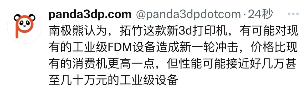 A senior executive from a consumer-grade 3D printer company, upon seeing this news, expressed admiration to Panda3dp.com, "Bambu Lab's capacity for innovation and technological advancement is incredible. I suspect this new machine in 2025 will leave other manufacturers struggling to catch up for years." △ Panda3dp.com couldn’t resist commenting on Bambu Lab’s tweet, using the account of the Chinese 3D printing export platform panda3dp.com. |