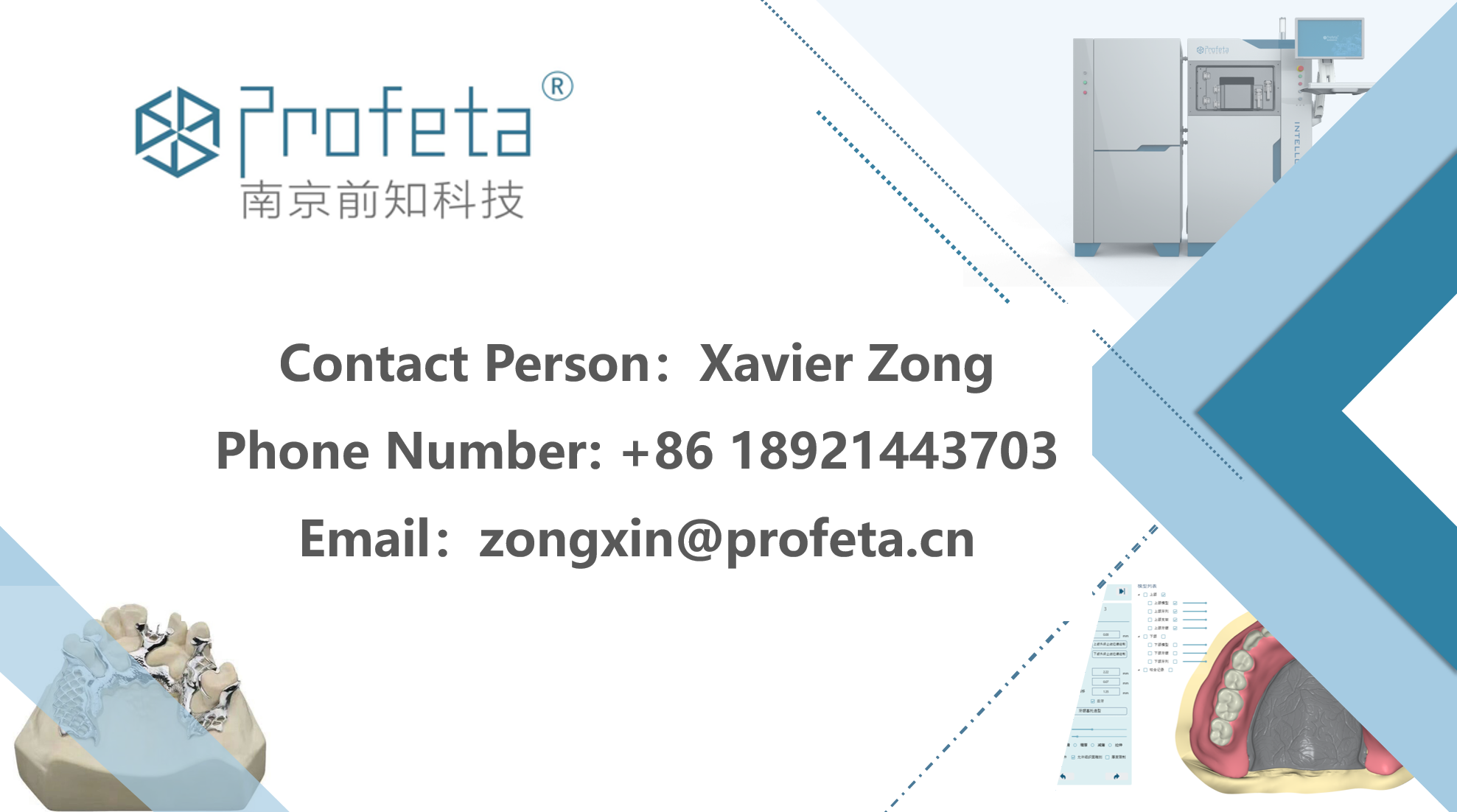 Profeta, a 2014-founded high-tech dental digital enterprise, offers comprehensive digital solutions. Its products are exported worldwide. Up to now, the total shipment volume has reached 300 units. It partners with Peking University in clinical innovations and provides high-quality one-stop solutions. In dentistry, demand for removable prosthetics and orthodontics is rising. However, the problems faced by customers include: a shortage of technicians, a long training cycle for technicians, and the inability of printed parts to meet the required quality standards, which affects business operations and patient satisfaction. Profeta is the sole company with an overall solution and advantages. We have independently developed CAD, CAM and equipment (metal 3d printers and wire bending machine), and integrated the three together. Consequently, it smooth the process and enables the customers to implement digital transformation. Solutions for Different Fields Solution for Removable Prosthetics CAD At present, the dental CAD software available on the market typically demands several months of training before one can become proficient in using it. In contrast, iPDenture developed by Profeta is both simple and intuitive. Merely a few days of training are required for users to start operating it. Simultaneously, by leveraging advanced algorithms, the process of designing removable partial dentures using this software only takes about 15 minutes. CAM The P3DS software developed by Profeta can accurately identify the different parts of a removable partial denture designed by iPDenture, including occlusal rests, clasps and so on support differently. Using P3DS for slicing also allows the option of higher-precision printing, thus obtaining a better fitting effect. Metal 3D printers IS 200: It has high printing efficiency for dental labs with large printing volumes. It's the dual-laser dental-specific metal 3D printer with high efficiency, supporting simultaneous printing of crowns, bridges, and removable denture frameworks (25-35 frameworks or 400 crowns and bridges in 4.5-5.5 hours). It has a large printing volume, can fully utilize 24-hour operation without night-shift overtime, and is unique in the domestic dental market. IE 150: For medium-sized dental laboratories focusing on printing quality and efficiency. It has a fast printing speed, with an efficiency advantage, printing 15 frameworks in 3-3.5 hours and 220 crowns and bridges in 3.5-4 hours. VP100 PRO: VP100 pro is designed to address the situations where some small dental laboratories have limited space and the need to print with two types of powders. Profeta has obtained patents for this type of machine. Solution for Orthodontics Traditicial orthodontics mainly uses bands and wires. Profeta supports design and manufacturing of both types.