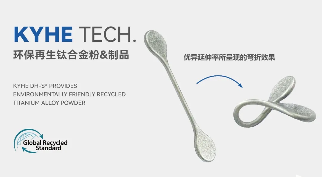Apple’s Benchmark: 100% Recycled Titanium Apple’s choice of recycled titanium is not merely a technical experiment, but a strategic move aligning with global manufacturing’s shift toward sustainability. Titanium alloys—lightweight, strong, and corrosion-resistant—are ideal for high-end applications, yet conventional production is energy-intensive and costly. The combination of recycling + additive manufacturing both closes the material loop and enables complex, efficient part designs—perfectly fitting Apple’s 2030 carbon-neutral roadmap. Kaihe has already achieved GRS 4.0 (Global Recycled Standard) certification, with its DH-S® powders labeled “100% Recycled Post-Consumer Titanium”, ensuring traceability and alignment with ESG goals.