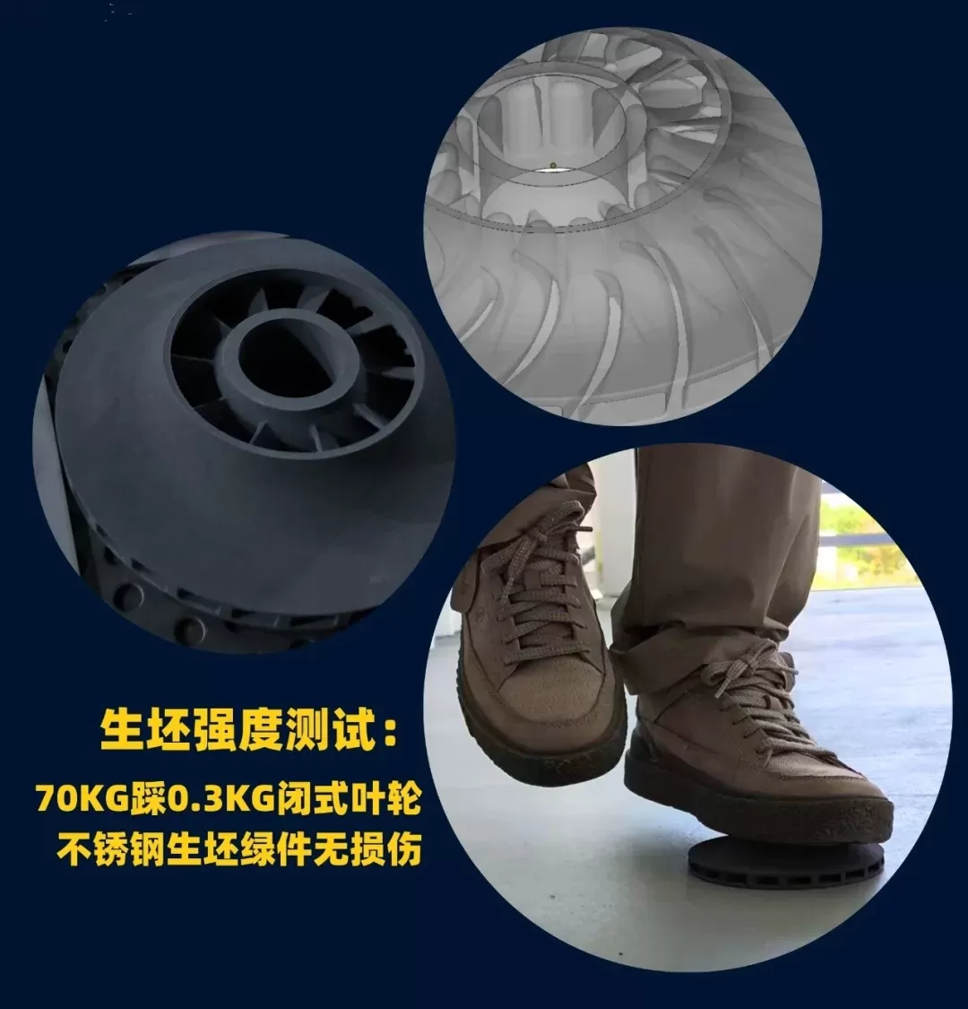 After printing, the parts undergo post-processing including machining, debinding, and sintering, resulting in fully dense metal components. The process effectively merges the front half of SLS (Selective Laser Sintering) with the latter stages of Binder Jetting (BJ) and Metal Injection Molding (MIM).