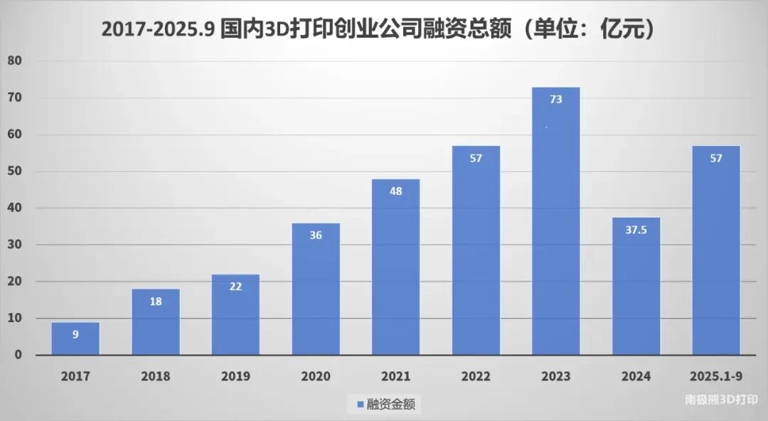 3. Venture Capital Floods the Sector According to Panda3dp.com’s analysis, 2025 has seen an unprecedented surge in investment activity within China’s 3D printing sector. · In the first three quarters alone, 61 companies secured 73 financing rounds, raising a total of RMB 5.7 billion — already surpassing the entire 2024 total. · If this pace continues, 2025’s total investment is expected to exceed RMB 7.3 billion, setting a new industry record. · Nearly every month has witnessed individual financing events exceeding RMB 200 million, signaling strong investor confidence and capital inflow. (See Panda3dp.com’s in-depth report: “61 Companies Secure Funding as 3D Printing Investment Booms in 2025.”)
