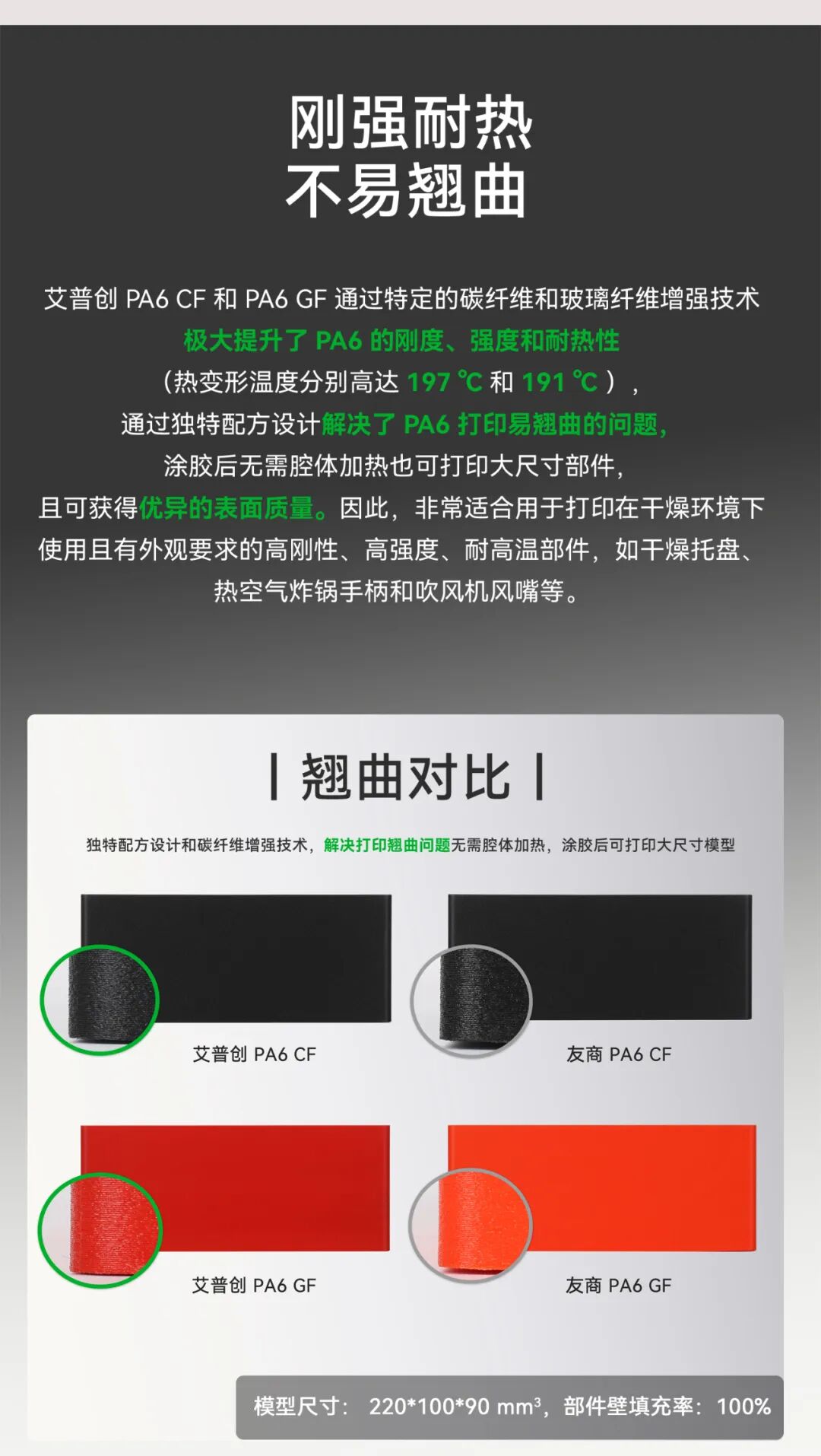 1. High Strength and Heat Resistance with Minimal Warping Through proprietary carbon and glass fiber reinforcement technologies, IPCON PA6 CF and PA6 GF exhibit exceptional stiffness, strength, and heat resistance — with heat deflection temperatures reaching 197°C and 191°C, respectively. This delivers a substantial leap in the mechanical performance of printed parts. More impressively, IPCON’s unique formulation effectively addresses PA6’s notorious warping issue. With a simple adhesive coating, large components can be printed without a heated chamber, while maintaining excellent surface finish. These properties make the materials ideal for high-strength, heat-resistant components used in dry environments that also demand good aesthetics — such as dehydrator trays, air fryer handles, and hairdryer nozzles.